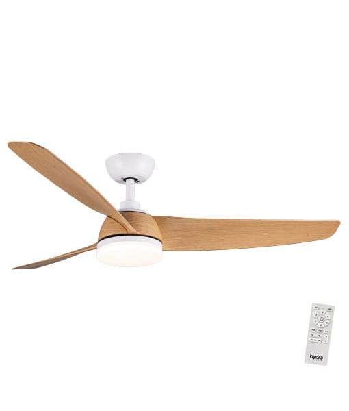 Ventilador de techo 52″ Hydra con palas color madera. Potente, silencioso y eficiente. Incluye control remoto, 6 velocidades, 3 tonos LED y función reversible.